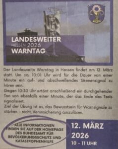 Am 12. März 2026 heulen in den hessischen Kommunen zum hessenweiten Probealarm ab 10:00 Uhr die Sirenen. Hintergrund und Ziel des Aktionstages ist es, die Bürger für die verschiedenen Warnmittel und Alarmsignale weiter zu sensibilisieren und die technische Warninfrastruktur zu testen.